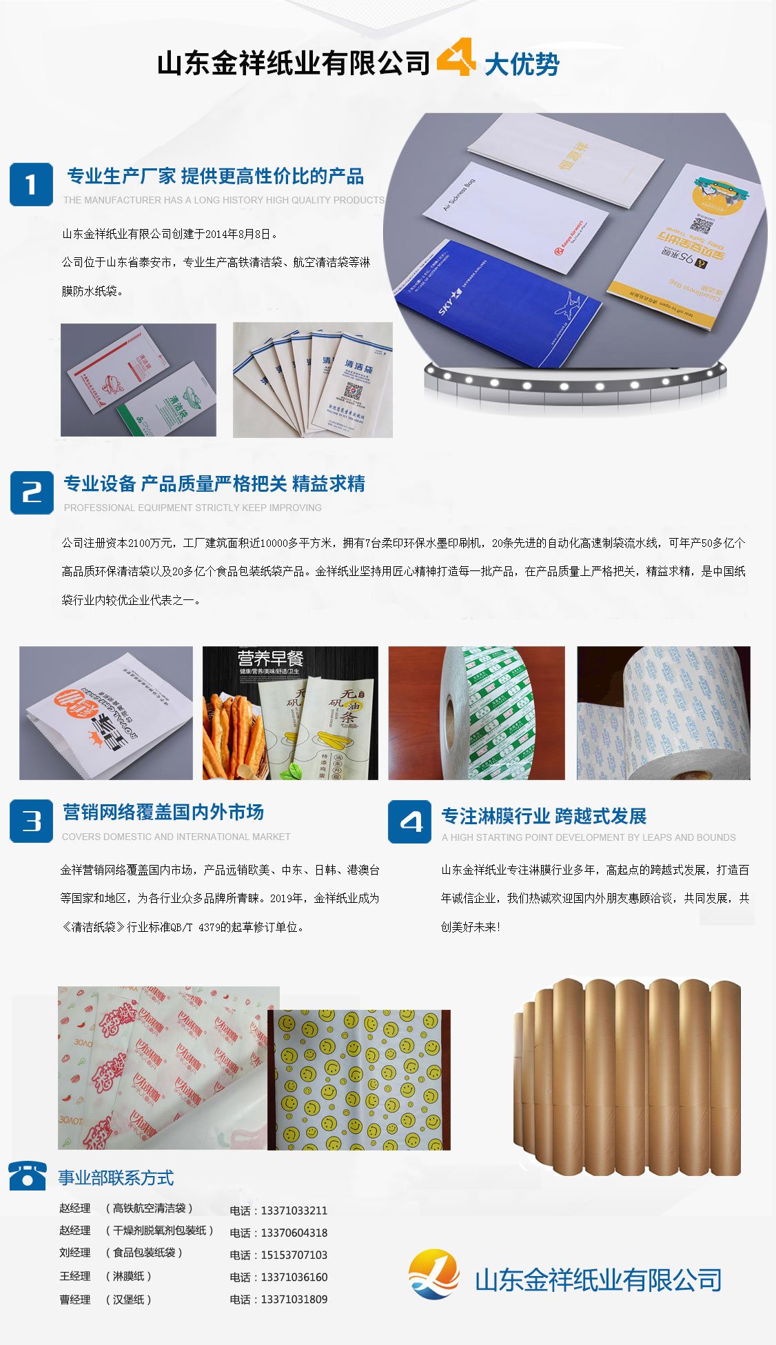 山東金祥紙業有限公司創建于2014年8月8日,公司位于山東泰安,專業生產高鐵清潔袋、航空清潔袋等淋膜防水紙袋。公司注冊資本2100萬元,工廠建筑面積近10000多平方米,擁有7臺柔印環保水墨印刷機,20條先進的自動化高速制袋流水線,可年產50多億個高品質環保清潔袋以及20多億個食品包裝紙袋產品。金祥紙業堅持用匠心精神打造每一批產品,在產品質量上嚴格把關,精益求精,是中國紙袋行業內較優企業代表之一。金祥營銷網絡覆蓋國內市場,產品遠銷歐美、中東、日韓、港澳臺等國家和地區,為各行業眾多品牌所青睞。2019年,金祥紙業成為《清潔紙袋》行業標準QB/T 4379的起草修訂單位。